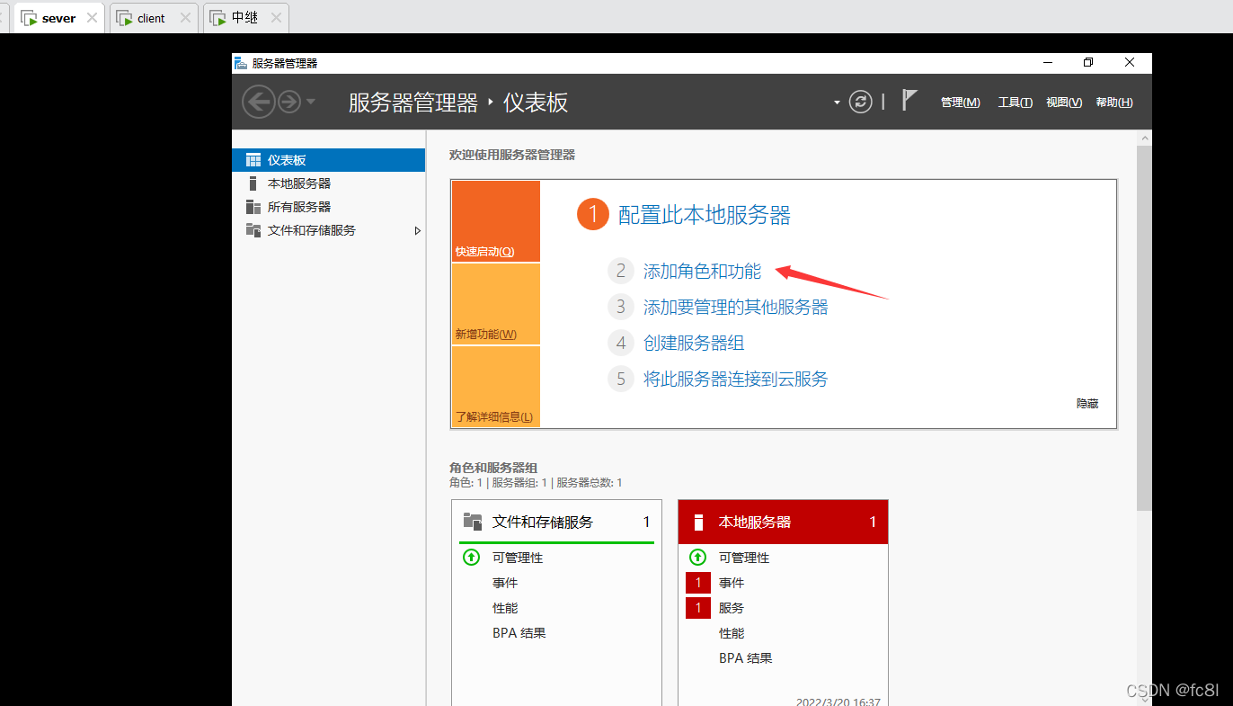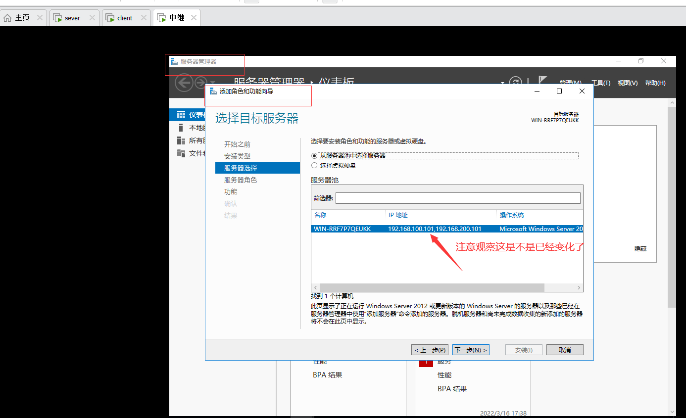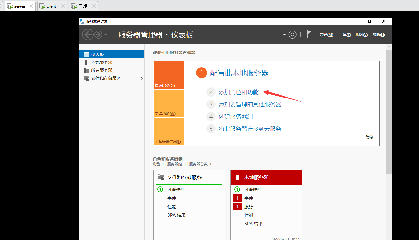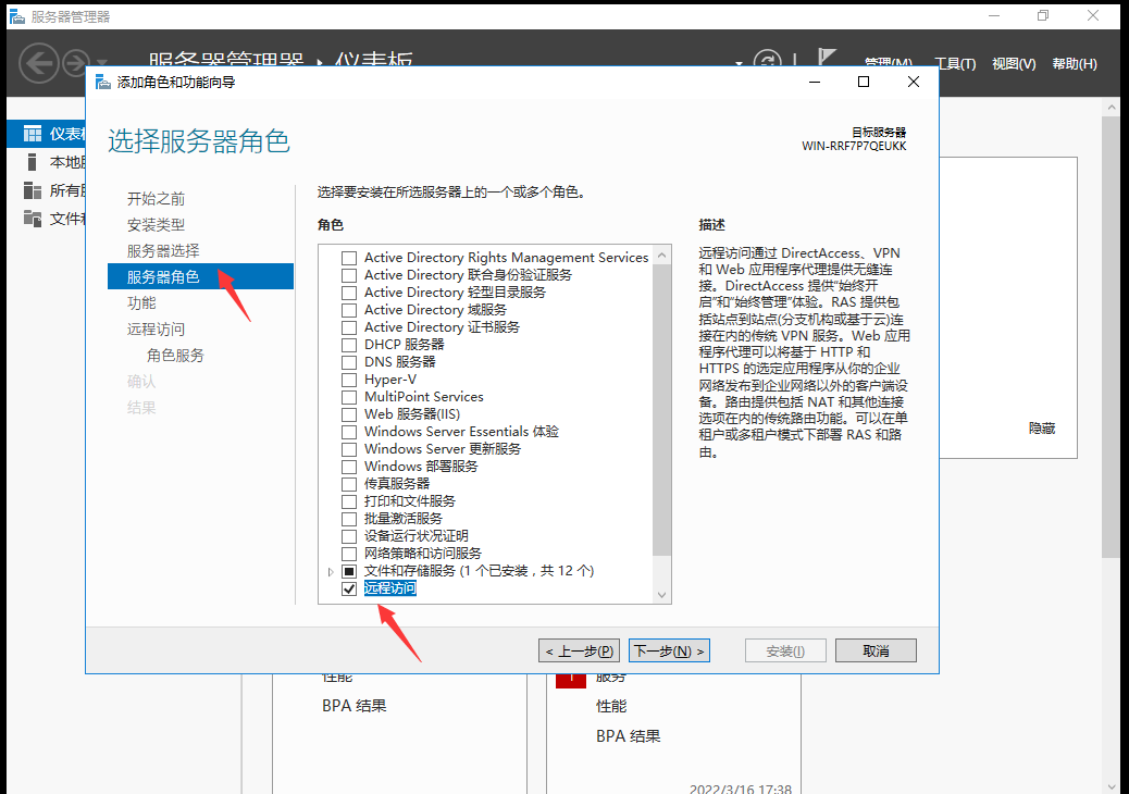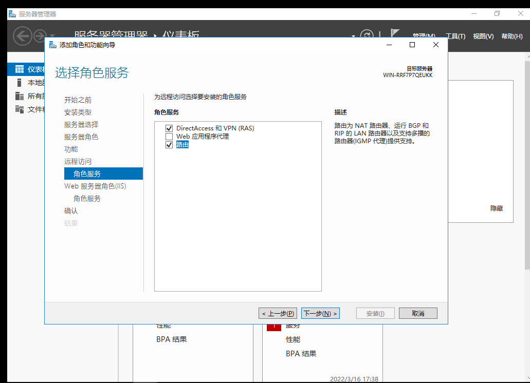 在中继的服务器管理器中------添加角色和功能---如果IP地址没变重启一下----下一步----在服务器角色里去安装一个远程访问的角色