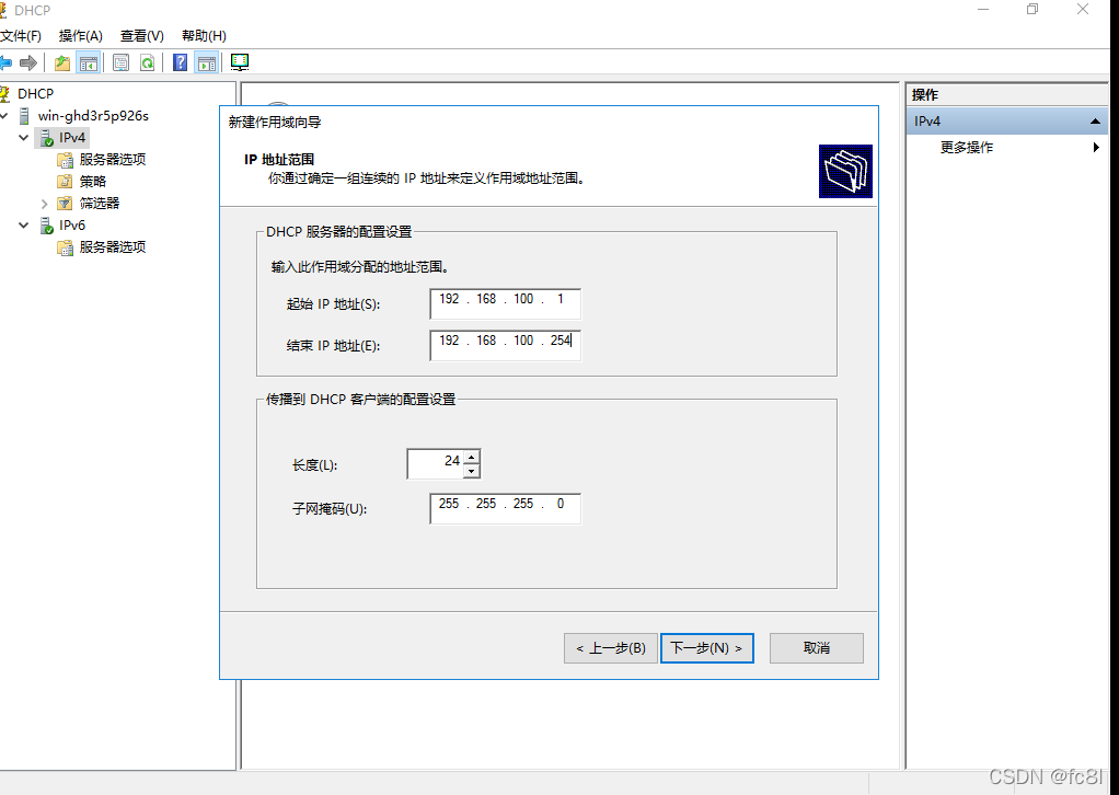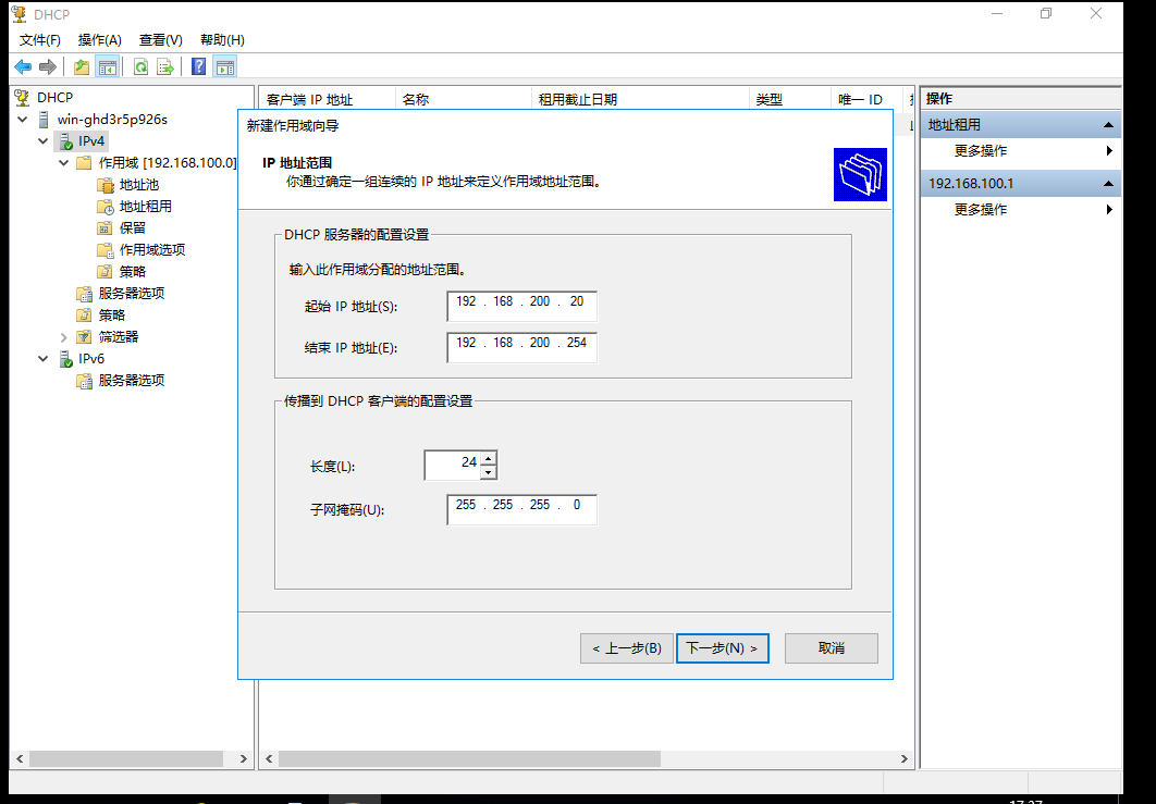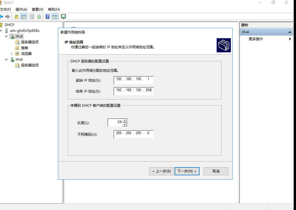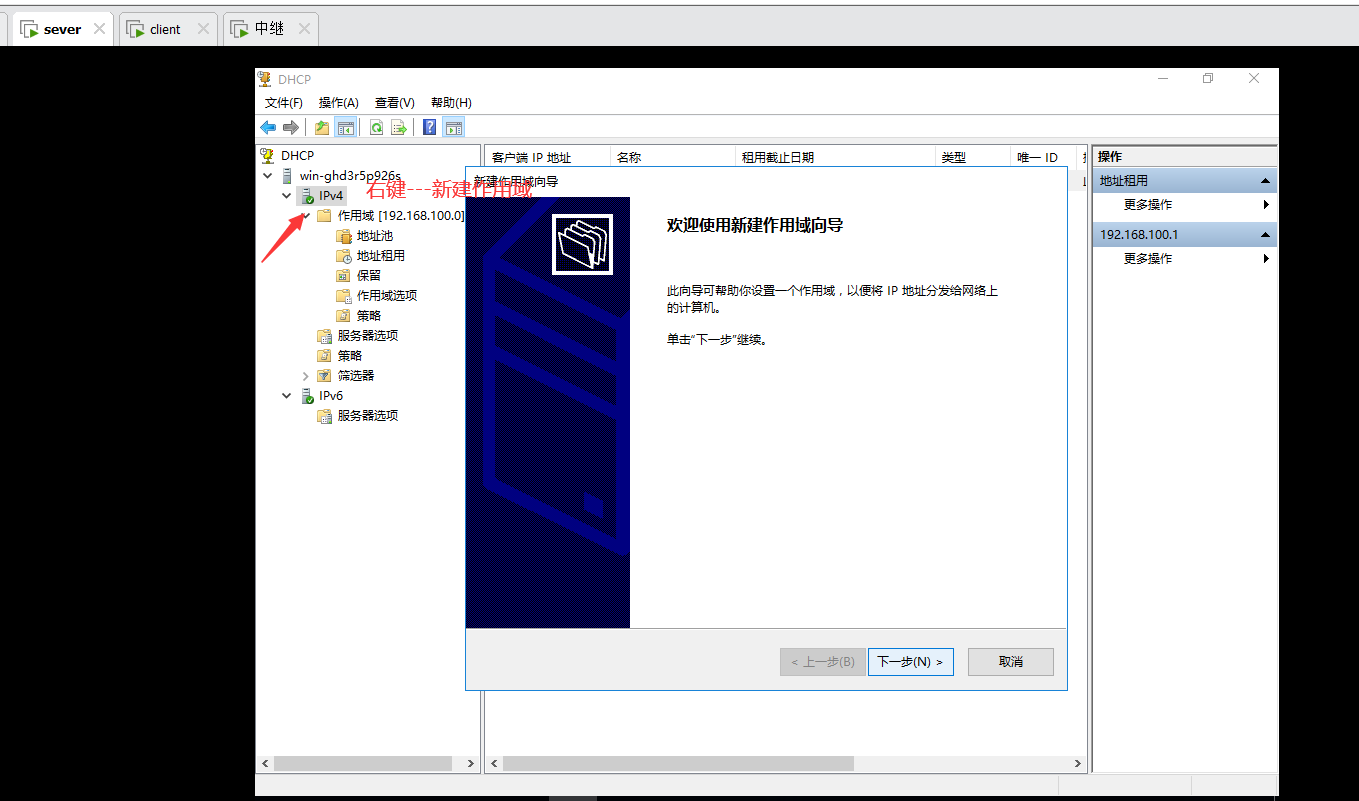 右击IPV4----新建作用域---名称为100(因为在100这个子网里,不过这个可以自己设置没关系的)。