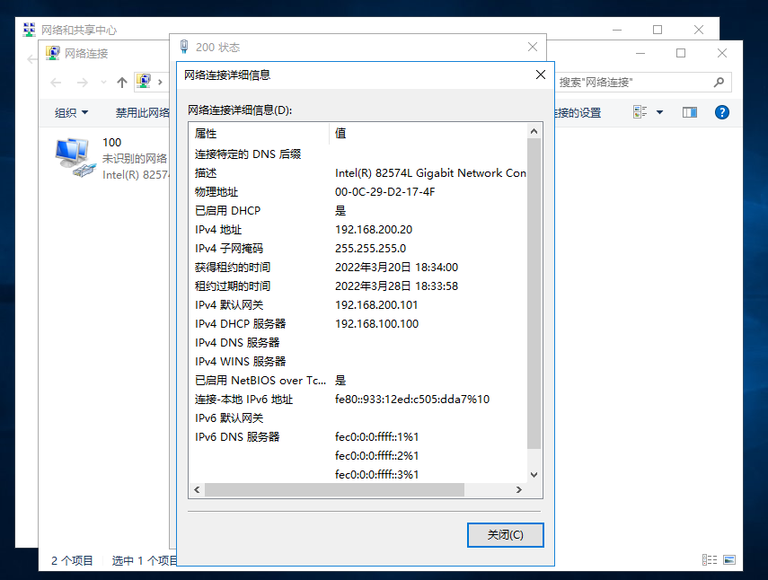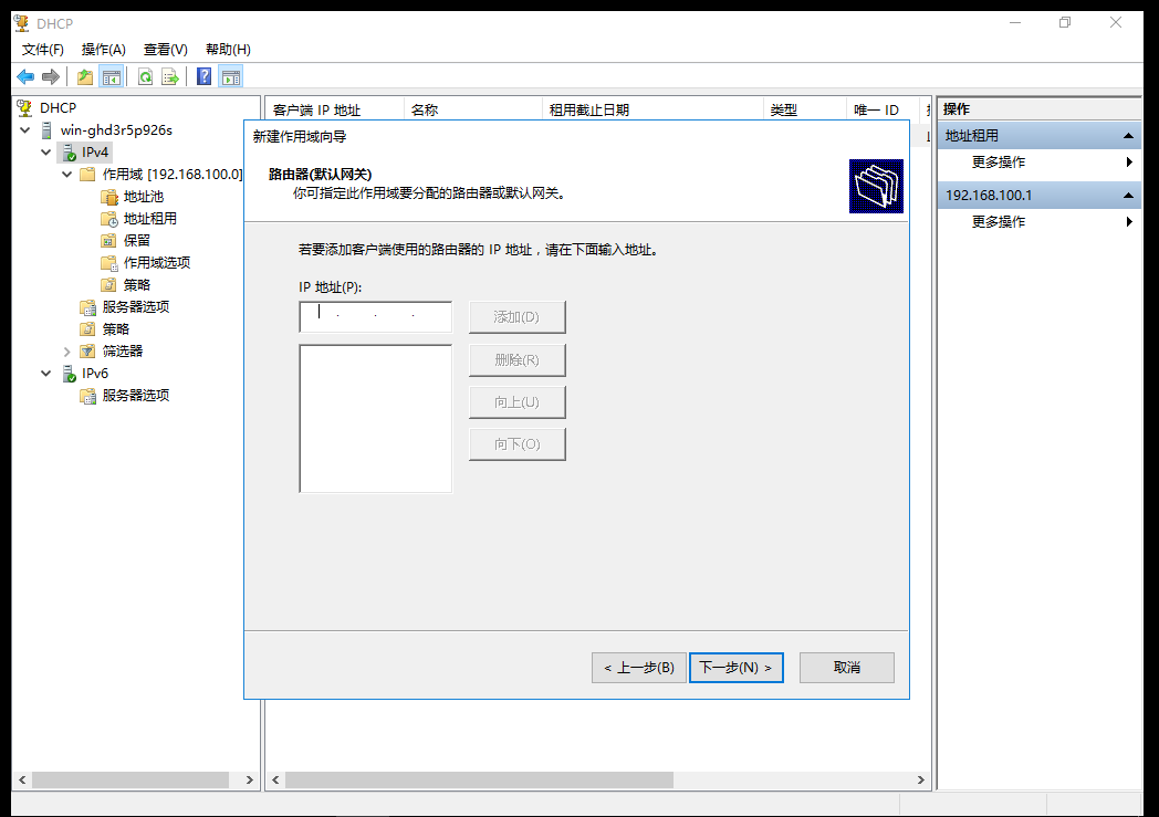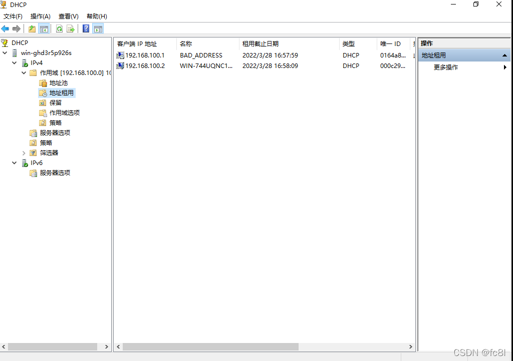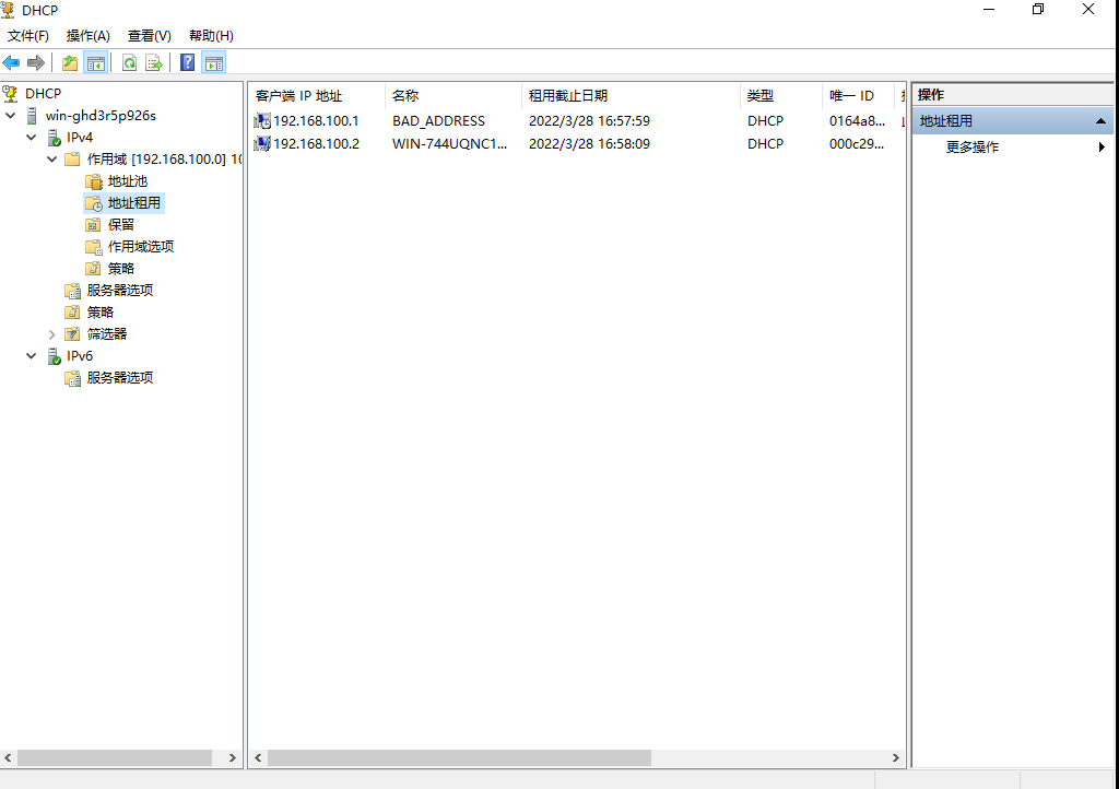 一直下一步直到安装。作用域就已经配置完成了,这时客户端已经分配了IP地址了。如果没有就禁用一下再启用,为什么会获取192.168.100.2这个IP呢,这时去到服务器端,查看一下作用域地址租用,发现192.168.100.1已经租用出去了