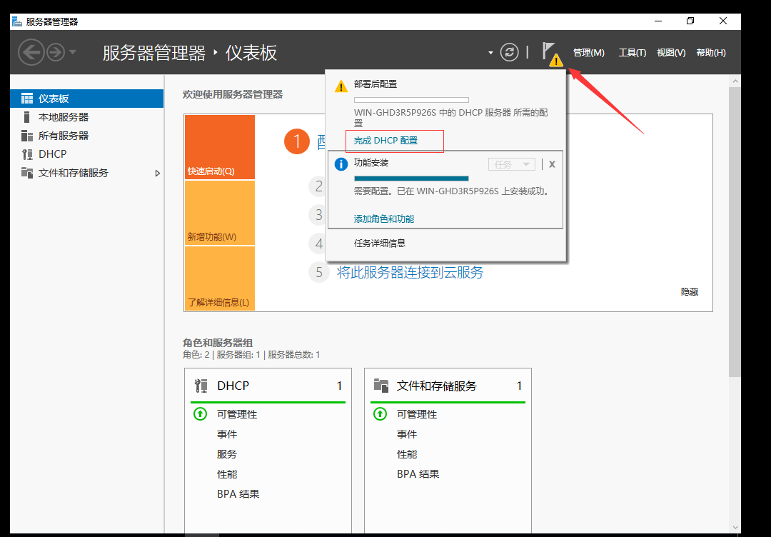 安装成功之后,会有一个黄色感叹号,点击它----完成DHCP配置。 然后提交----关闭