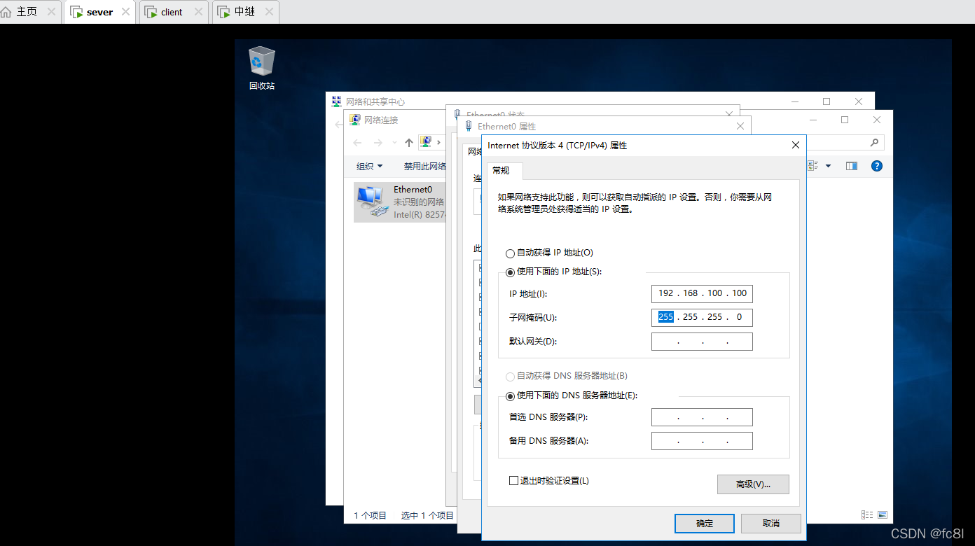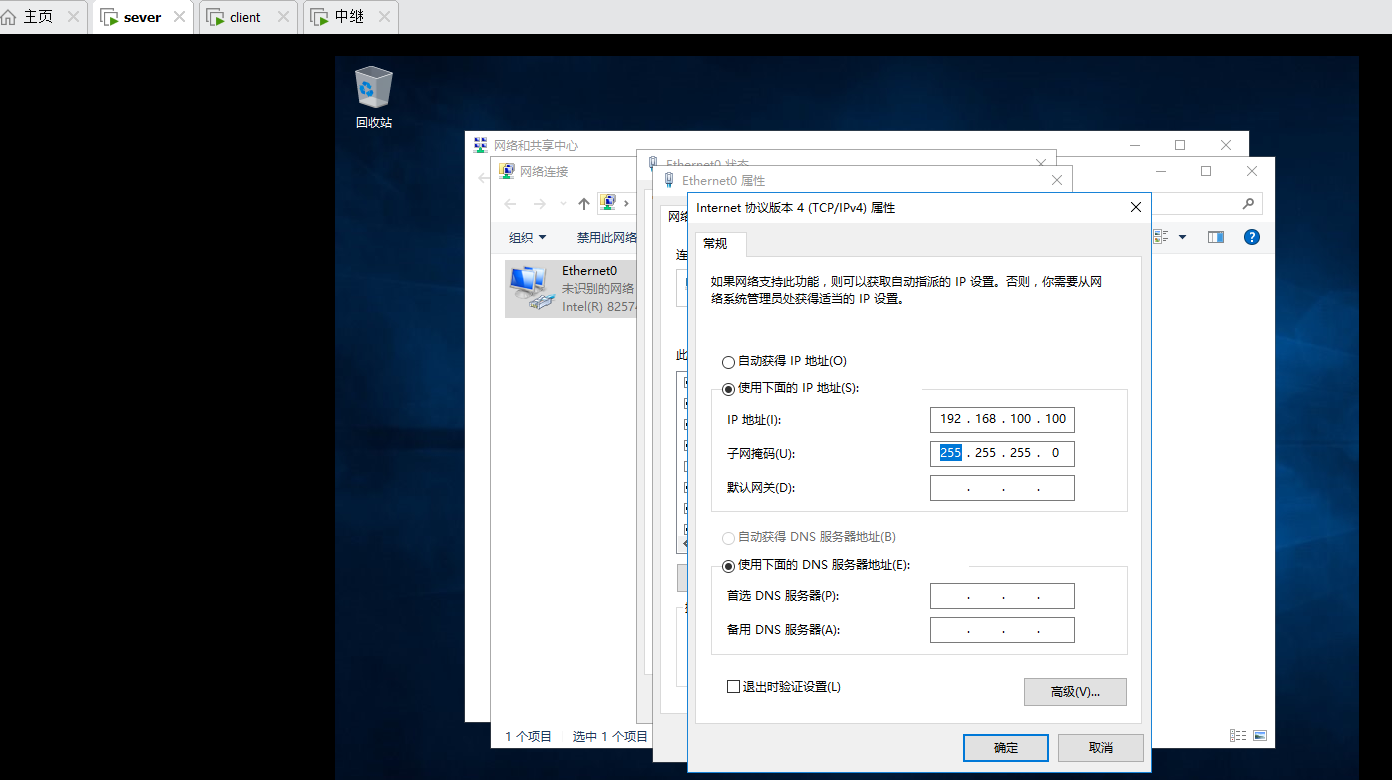 这里需要配置网关,我们的目的是让中继当一个中间人,首先要将两个不同网段客户端连起来,网关也就是中继的IP地址。网关配置为192.168.200.101