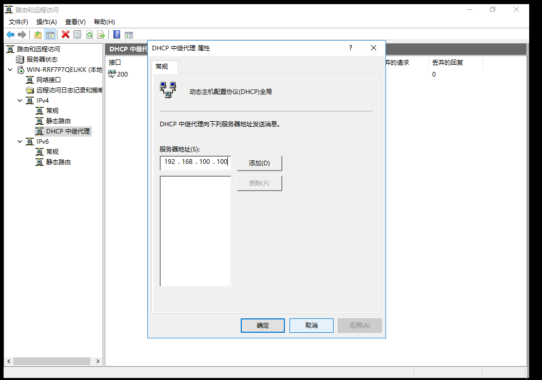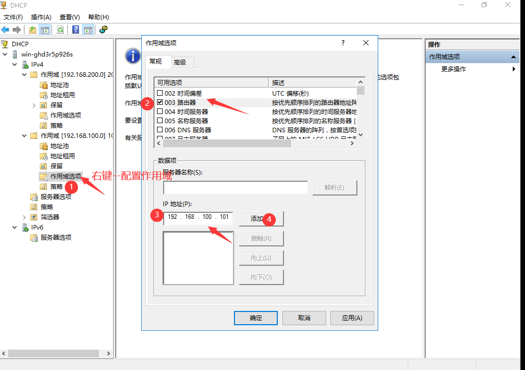 配置192.168.100.0的作用域选项 网关为192.168.100.101,这时也还是获取不到,中继还没有操作。