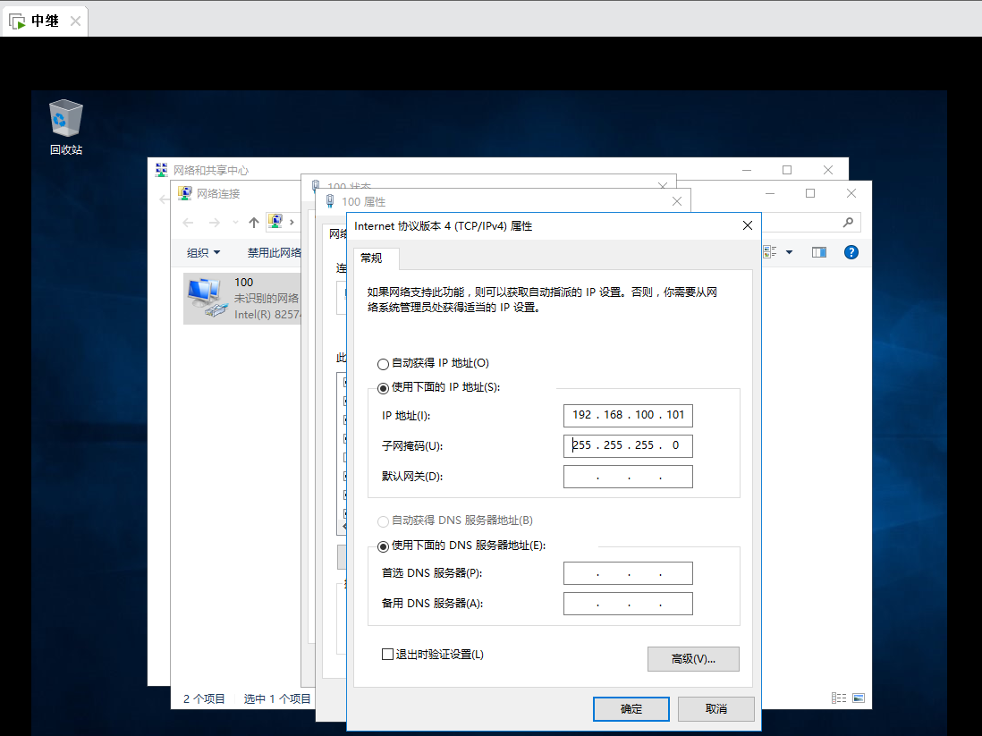 100的网卡配置IP地址为192.168.100.101 也就是VMnet10连接中继的网关