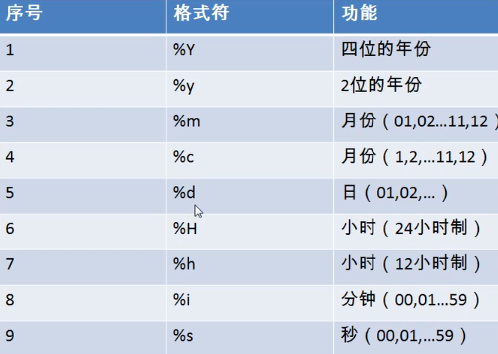 select str_to_date('1998-3-2', '%Y-%c-%d') as out_put;#查询入职日期为1992-4-3的员工信息select * from employees where hiredate = '1992-4-3';select * from employees where hiredate = str_to_date('4-3 1992', '%c-%d %Y');date_format:将日期转换成字符串select date_format(now(), '%Y年%m月%d日') as out_put;#查询有奖金的员工名和入职日期(xx月/xx日 xx年)select last_name, date_format(hiredate, '%m月/%d日 %y年') 入职日期 from employees;#计算现在的日期和一个给定日期的差值(天数)select datediff(now(), '2016-6-9');