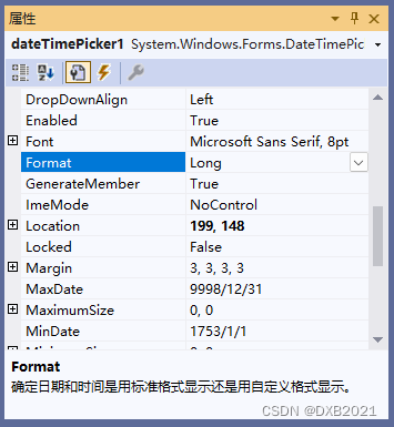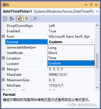 而Format属性用于确定日期和时间是用标准格式显示还是用自定议格式显示 ,该属性有四个枚举值。