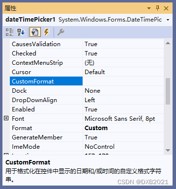 | Custom | DateTimePicker控件以自定义格式显示日期/时间值 |
