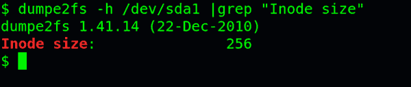 sudo dumpe2fs -h /dev/hda | grep "Inode size"