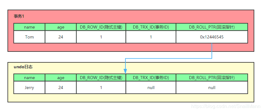 一、 比如一个有个事务插入 persion 表插入了一条新记录,记录如下,name为 Jerry,age 为 24 岁,隐式主键是 1,事务 ID 和回滚指针,我们假设为 NULL。
