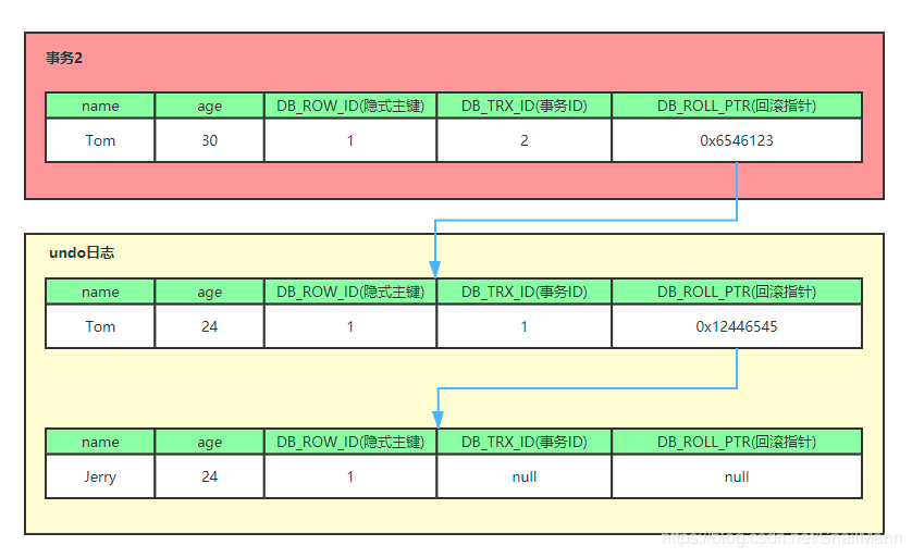 - 拷贝完毕后,修改该行 name 为 Tom,并且修改隐藏字段的事务 ID 为当前事务 1 的 ID,我们默认从 1 开始,之后递增,回滚指针指向拷贝到 undo log 的副本记录,既表示我的上一个版本就是它
