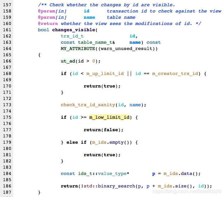 如上,它是一段 MySQL 判断可见性的一段源码,即 changes_visible 方法(不完全哈,但能看出大致逻辑),该方法展示了我们拿 DB_TRX_ID 去跟 Read View 某些属性进行怎么样的比较