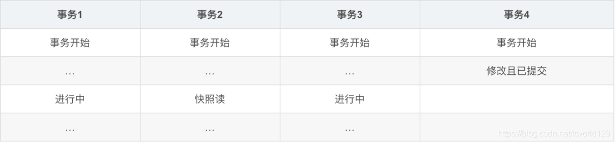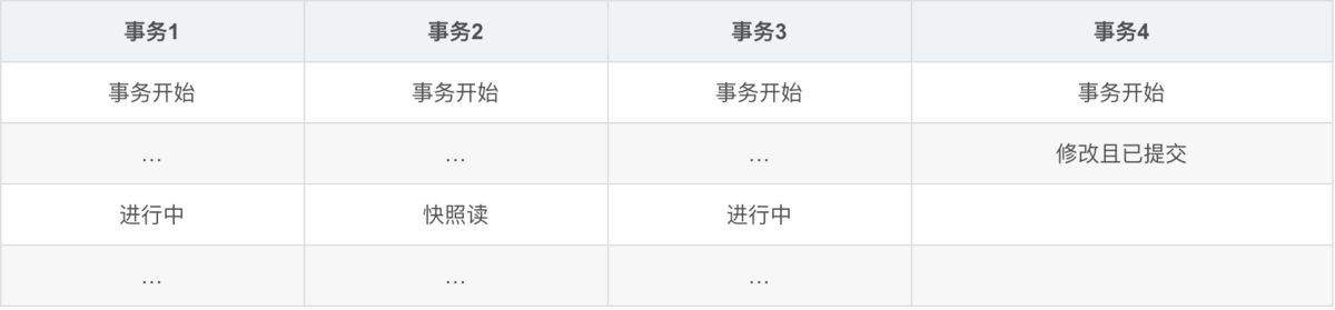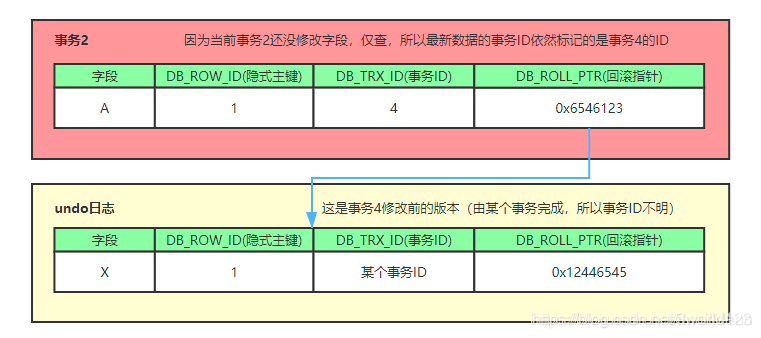 我们的例子中,只有事务 4 修改过该行记录,并在事务2执行快照读前,就提交了事务,所以当前该行当前数据的undo log如下图所示;我们的事务2在快照读该行记录的时候,就会拿该行记录的DB_TRX_ID去跟up_limit_id,low_limit_id和活跃事务ID列表(trx_list)进行比较,判断当前事务2能看到该记录的版本是哪个。