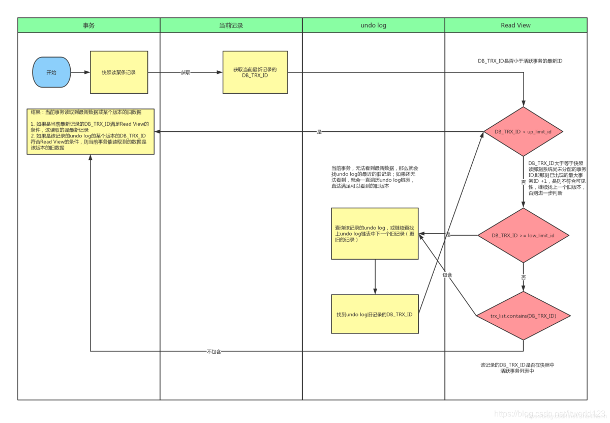 - 接下来判断 DB_TRX_ID 大于等于 low_limit_id , 如果大于等于则代表 DB_TRX_ID 所在的记录在 Read View 生成后才出现的,那对当前事务肯定不可见,如果小于则进入下一个判断。