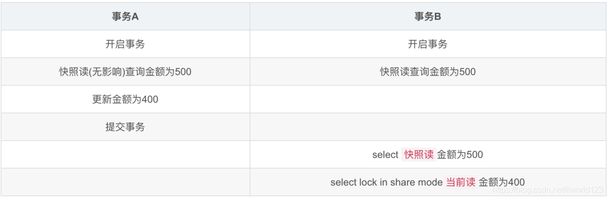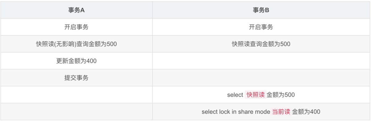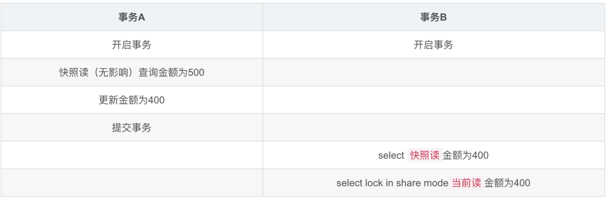 - 这里与上表的唯一区别仅仅是表 1 的事务 B 在事务 A 修改金额前快照读过一次金额数据,而表2的事务B在事务 A 修改金额前没有进行过快照读。