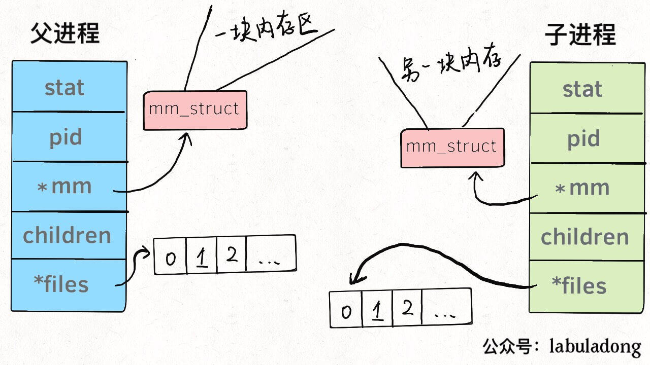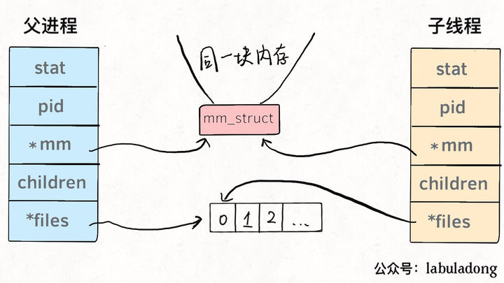 换句话说,线程看起来跟进程没有区别,只是线程的某些数据区域和其父进程是共享的,而子进程是拷贝副本,而不是共享。就比如说,mm 结构和 files 结构在线程中都是共享的,我画两张图你就明白了: