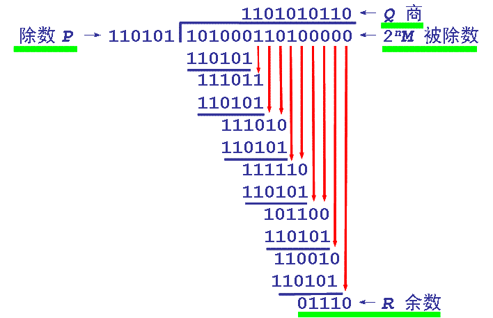 1、在 1010001101 后面添加 5 个 0,因为除数为 6 位,所以余数为 5位,最后将余数添加到 1010001101 后面得到结果 101000110101110。