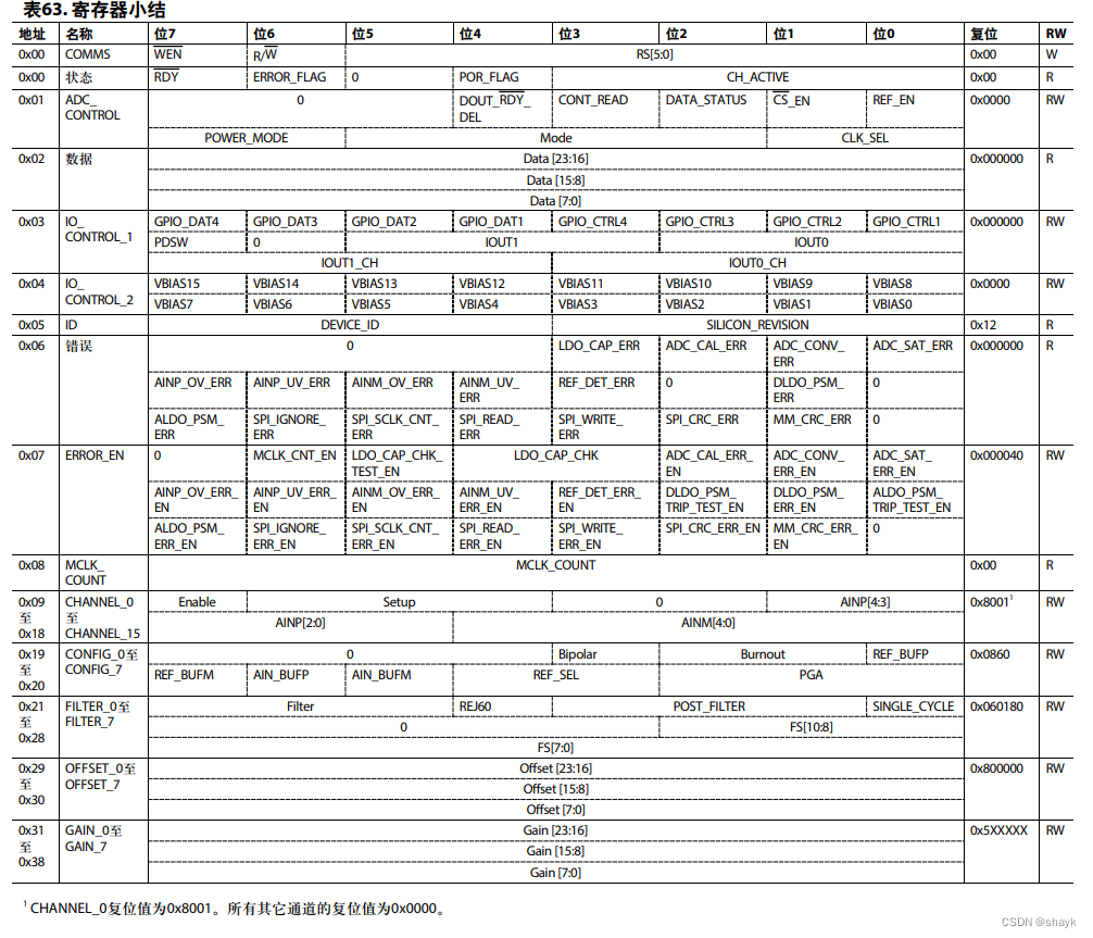// printf("\n\n%d\r:%s.... RUN\r\n",tls_os_get_time(),__FUNCTION__);tls_gpio_cfg(spi_cs, WM_GPIO_DIR_OUTPUT, WM_GPIO_ATTR_PULLHIGH);tls_gpio_cfg(spi_ck, WM_GPIO_DIR_OUTPUT, WM_GPIO_ATTR_PULLHIGH);tls_gpio_cfg(spi_di, WM_GPIO_DIR_INPUT, WM_GPIO_ATTR_FLOATING);tls_gpio_cfg(spi_do, WM_GPIO_DIR_OUTPUT, WM_GPIO_ATTR_PULLHIGH);tls_gpio_cfg(spi_sync, WM_GPIO_DIR_OUTPUT, WM_GPIO_ATTR_PULLHIGH);tls_gpio_cfg(spi_reset, WM_GPIO_DIR_OUTPUT, WM_GPIO_ATTR_PULLLOW);tls_gpio_write(spi_sync,1);//resetSPI_Ad7124_Reset();Ad7124_DELAY;//必须Spi_Ad7124_ReadRaw(0);//通道 channel0x09 15:通道使能 14-12:setup 11-10:00 9-5:ainp/4-0:ainm ain2/ain3Spi_Ad7124_WriteRaw(0x9, 0x8043);//[15]:1 [14:12]:000 [9:5]:00010 [4:0]:00011 0x8043 1000 0000 0100 0011//配置 reg_config0x19 极性/开路电流幅度/REFIN、AIN缓冲使能/REF_SEL0/PGA32Spi_Ad7124_WriteRaw(0x19, 0x1e5);//[8]:1 [7]:1 [6]:1 [5]:1 [4:3]:00 [2:0]:101 0x1e5 1 1110 0101 //fiter过滤器 0x21 23-21:过滤器类型000:sinc4 010:sinc3 100:sinc4快速 101:sinc3快速 111:后置滤波器使能//20:REJ60 19-17:POST_FITER 011:sps25 62dB 16:Single_cycle单周期转换使能 15-11:00000 10-0:FS滤波器输出速率选择1-2047Spi_Ad7124_WriteRaw(0x21, 0x160080);// 0001 0110 00000000 10000000//Spi_Ad7124_WriteRaw(0x21, 0x1c0080); // 0001 1100 00000000 10000000//Spi_Ad7124_WriteRaw(0x21, 0x60080); // 0110 00000000 10000000//gain增益 0x32//Spi_Ad7124_WriteRaw(0x32, 0x1e5);//offset失调 0x29//Spi_Ad7124_WriteRaw(0x29, 0x1e5);//诊断//adc控制 0x1 12:DOUT_RDY_DEL/11:CONT_READ连续读取/10:data_status/9:cs_en/8:ref_en内部基准电压使能/7-6:功耗模式/5-2:工作模式连续读取/1-0:clk_selSpi_Ad7124_WriteRaw(0x1, 0x04c0);//[11]:0 [10]:1 [7:6]:11 [5:2]:0000 [1:0]:00 0x4c0 0100 1100 0000//IO_CONTROL 0x3 0x3:24-20数字输出Px/19-16数字输出Px使能/15:PDSW电桥/14:0/13-11:Iout1电流100=500uA/10-8:Iout0电流100=500uA/7-4:Iout1_ch 000:AIN0/3-0:Iout0_ch 0001:AIN1Spi_Ad7124_WriteRaw(0x3, 0x2401); //[13:11]:100 [10:8]:100 [7:4]:0000 [3:0]:0001 0x2401 0010 0100 0000 0001//Spi_Ad7124_WriteRaw(0x4, 0x8c0);//内部偏置电压ain15-0printf("\n%d\r:%s....reg:0x9 0x8043 data:0x%x \r\n",tls_os_get_time(),__FUNCTION__,Spi_Ad7124_ReadRaw(0x9));printf("\n%d\r:%s....reg:0x19 0x1e5 data:0x%x \r\n",tls_os_get_time(),__FUNCTION__,Spi_Ad7124_ReadRaw(0x19));printf("\n%d\r:%s....reg:0x1 0x14c0 data:0x%x \r\n",tls_os_get_time(),__FUNCTION__,Spi_Ad7124_ReadRaw(0x1));printf("\n%d\r:%s....reg:0x3 0x2401 data:0x%x \r\n",tls_os_get_time(),__FUNCTION__,Spi_Ad7124_ReadRaw(0x3));