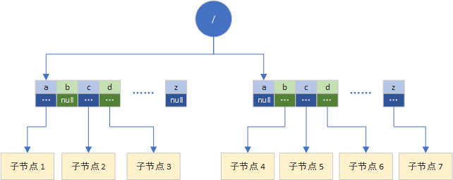 上图中每一个(子节点 n),都是包含了 26 个元素的数组,每个元素有可能有子节点,有的有可能是 null,为 null 就说明当前的字符串到此为止。
