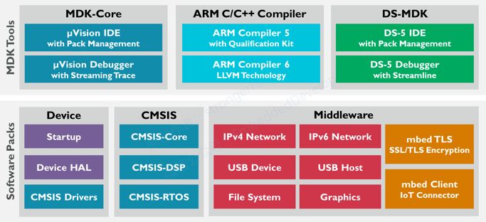 与Keil MDK4及之前版本不同,Keil MDK5分成MDK Core和Software Packs两部分。MDK Core主要包含uVision5 IDE集成开发环境和ARM Compiler5。Software Packs则可以在不更换MDK Core的情况下,单独管理(下载、更新、移除)设备支持包和中间件更新包。