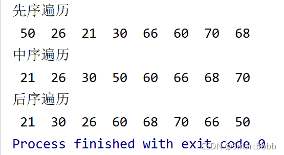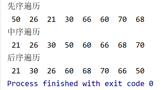 public class TestBinary {public static void main(String[] args) {//给定序列int[] arr = {50,66,60,26,21,30,70,68};BST bst = new BST();bst.createBst(arr);System.out.println("\n先序遍历");bst.preOrder(bst.root);System.out.println("\n中序遍历");bst.inOrder(bst.root);System.out.println("\n后序遍历");bst.postOrder(bst.root);}