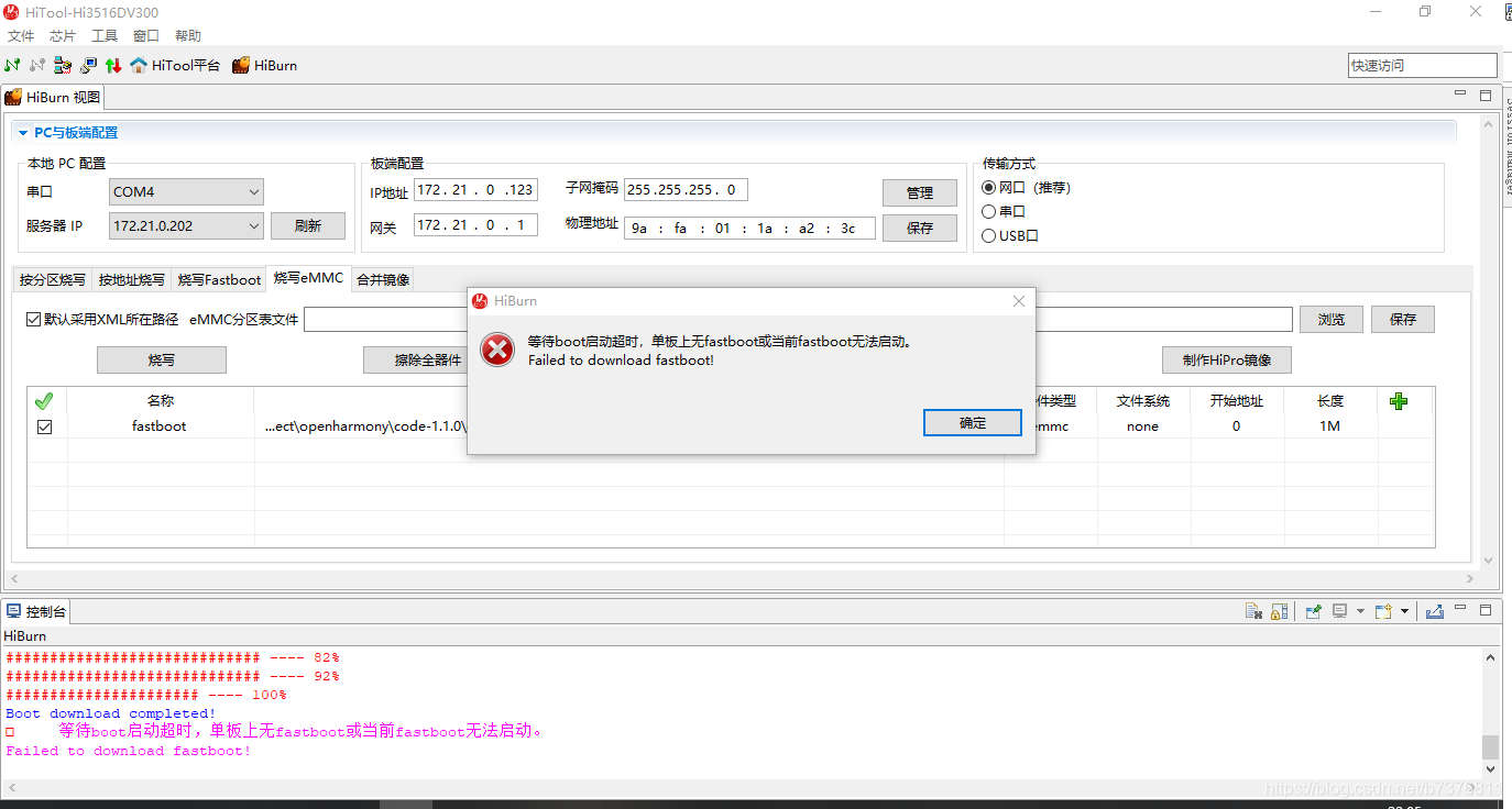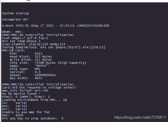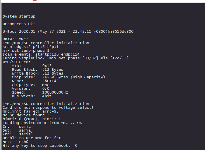 和3516先关的配置和默认的镜像文件在device文件夹里面,具体的路径为/device/hisilicon/hispark_taurus/sdk_liteos/uboot,uboot的源码在/device/hisilicon/third_party/uboot/u-boot-2020.01,在openharmony官方的文档中介绍说: Hi3516DV300单板的U-boot文件获取路径:device/hisilicon/hispark_taurus/sdk_liteos/uboot/out/boot/u-boot-hi3516dv300.bin,找到这个文件夹,嗨,还真有这个文件,二话不说,先把这个镜像烧进板子再说,openharmony的官方文档推荐的使用vs code 加 deveco device tool插件进行烧写,这种方式搞了好久,也没成功,而且还让身体的某个部位疼,最后没有办法,使用海思的hitool,可是烧录成功后,总是启动不起来,总是提示这个: