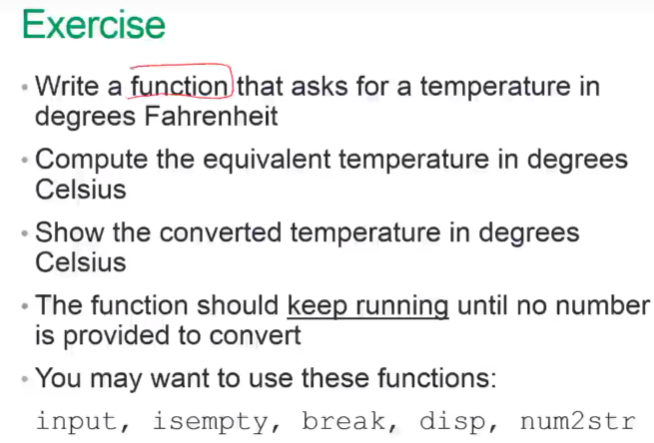 while 1 % 这是一个无限循环,它会一直执行下去,% 直到遇到 break 语句才会退出循环。F_degree = input('Tempreature in F:','s'); % 这行代码从用户处获取输入,要求用户输入一个华氏度的温度值,% 并将其存储在 F_degree 变量中。'Tempreature in F:' 是输入提示文本。F_degree = str2num(F_degree); % 这行代码将用户输入的温度值(字符串类型)转换为数值类型,% 并将结果存储回 F_degree 变量中。if isempty(F_degree)breakend %这个条件语句检查 F_degree 是否为空。% 如果用户没有输入任何内容,那么 F_degree 将为空,这时会执行 break 语句,退出循环。C_degree = (F_degree - 32).*5/9;disp(['Tempreature in Celsius:' num2str(C_degree)])% 这行代码使用 disp 函数在命令窗口中显示转换后的摄氏度值。% 它将摄氏度值转换为字符串,然后与前缀文本 'Tempreature in Celsius:' 连接起来进行显示。end