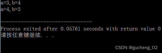#include int main(void) {int a = 3, b = 4;int *p, *q;int t;printf("a=%d,b=%d\n", a, b);p = &a, q = &b;t = *p, *p = *q, *q = t;printf("a=%d,b=%d\n", a, b);
