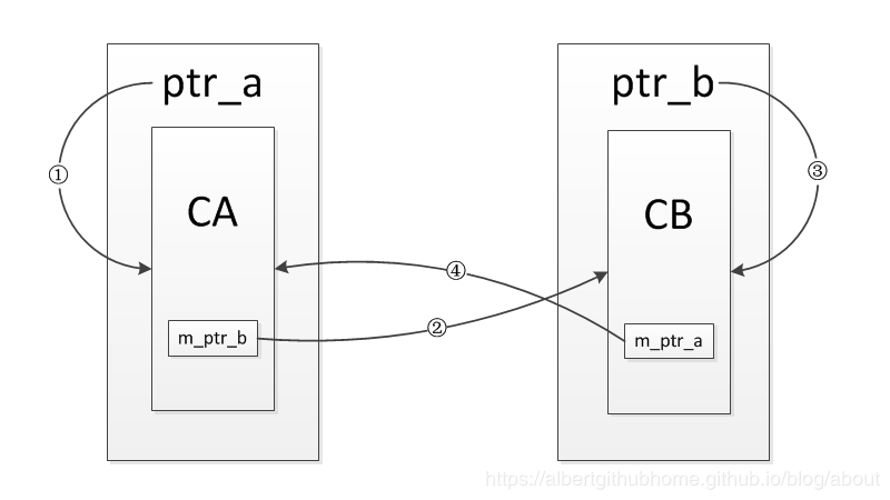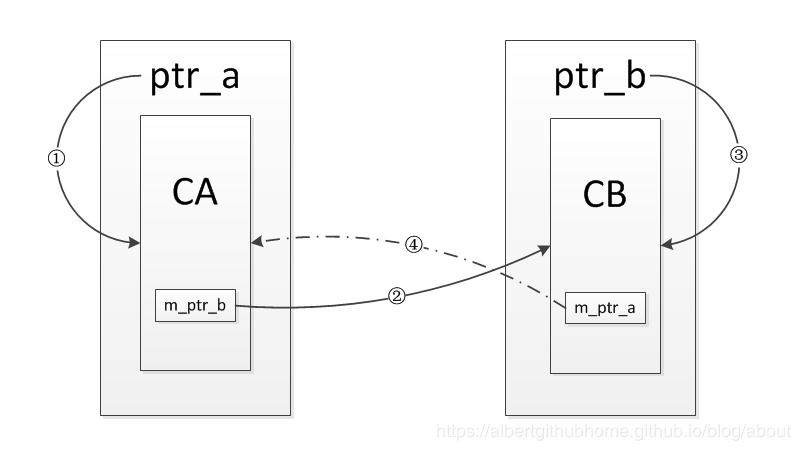 通过这次结果可以看到,CA 和 CB 的对象都被正常的析构了,引用关系如下图所示,流程与上一例子相似,但是不同的是 ④ 这条引用是通过 weak_ptr 建立的,并不会增加引用计数,也就是说 CA 的对象只有一个引用计数,而 CB 的对象只有 2 个引用计数,当 test_refer_to_each_other 这个函数返回时,对象 ptr_a 和 ptr_b 被销毁,也就是①③两条引用会被断开,此时CA对象的引用计数会减为0,对象被销毁,其内部的 m_ptr_b 成员变量也会被析构,导致 CB 对象的引用计数会减为0,对象被销毁,进而解决了引用成环的问题。