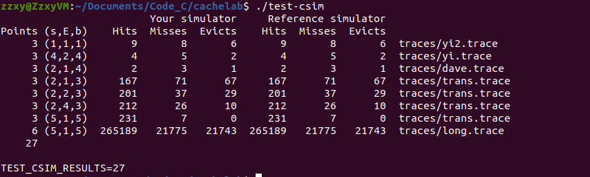 }int main(int argc, char **argv) {GetCmd(argc, argv);cacheline *cache = InitCache();int *time_table = InitTimeTable();Sim(cache, time_table);free(cache);free(time_table);printSummary(hit_count, miss_count, eviction_count);return 0;