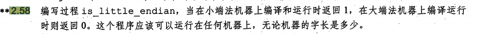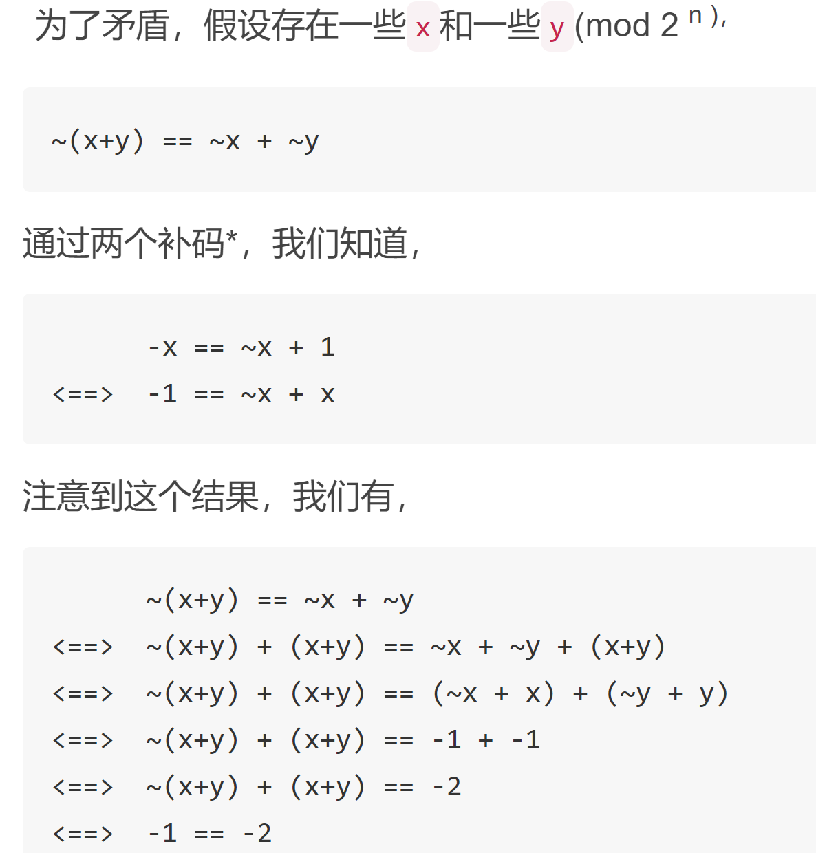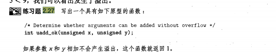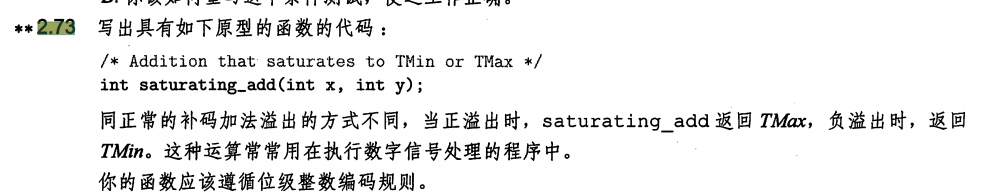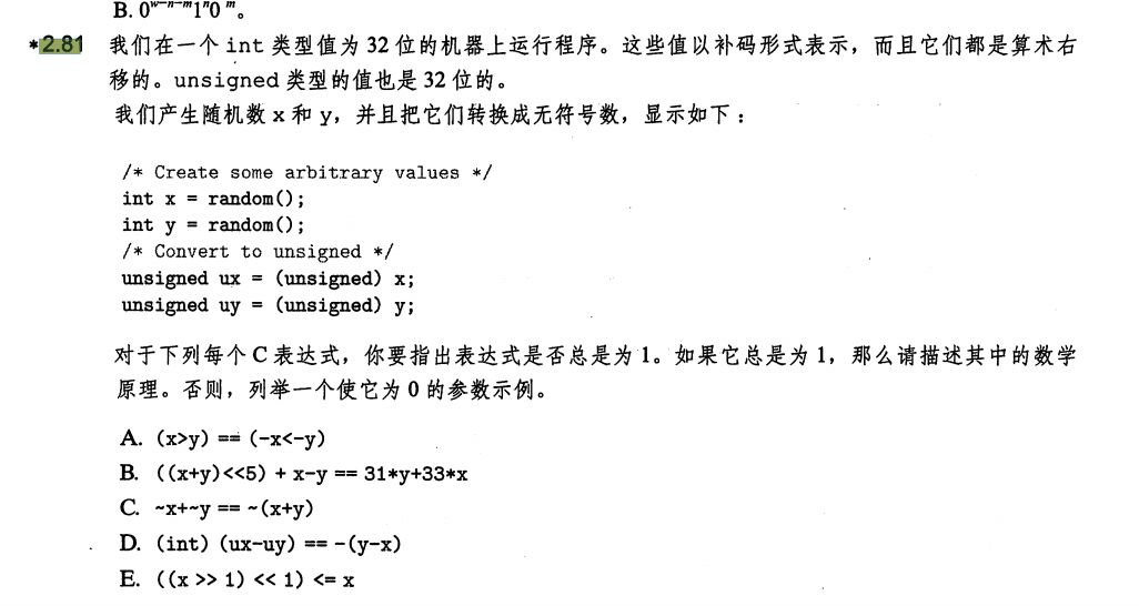 两个unsigned类型的变量x和y,那么x,y都小于2的32次方。设x+y溢出为z,则z=x+y-2的32次方。则可以推出z-x=y-2的32次方。所以z-x<0,同理z-y<0。所以只要z int uadd_ok(unsigned x, unsigned y) { unsigned z = x + y; if(z < x) return 0; return 1; } 2.73 先了解一下溢出 正溢出:两个正数相加的结果超过了数据类型所能表示的最大范围,结果为负数 负溢出:两个负数相加的结果超过了数据类型所能表示的最小范围,结果为正数(包括0) int saturating_add(int x, int y) { //x,y为0,算数位移计算出的r为0xffffffff (补1) 计算出pos_of = 0xffffffff 对应tmax=0x7f..f //x,y为0xffffffff,r为0 对应tmin==0x80000000; 2.81 A 错误,寻找特殊情况,当x=0,y=tmin(-2^31)时,x>y,但-y依旧是tmin,并不会发生改变,-x>-y B 正确,整数左移5位相当于乘以32, C 错误, D 正确,这个等价于 (x-y)==-(y-x) 是永远成立的,无符号和有符号数的位级表示是相同的。 E 正确,最后一个bit清0,对于偶数是不变的,对于奇数相当于-1,而tmin是偶数,因此该减法不存在溢出情况。所以左边总是<=x。