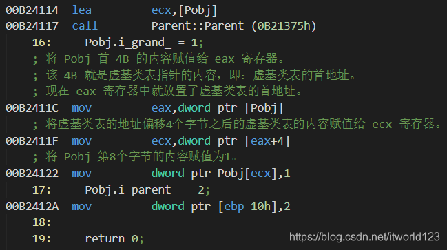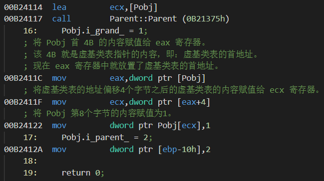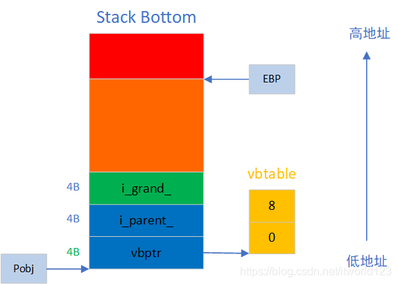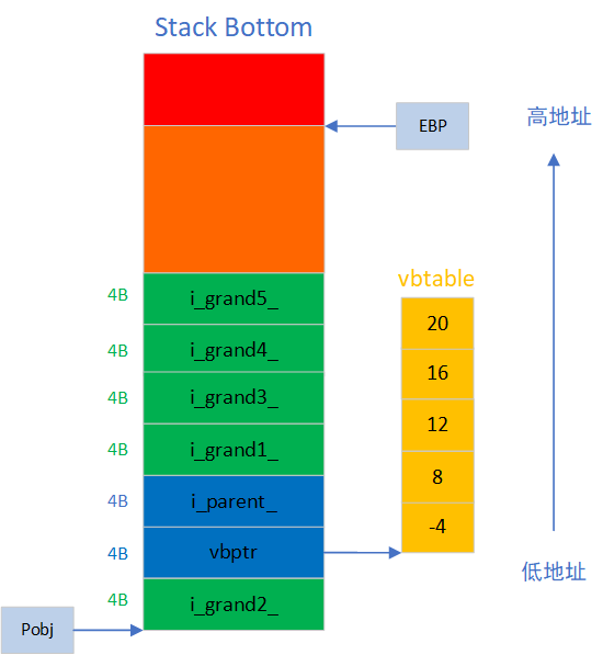 根据汇编代码可知,编译器正是通过虚基类表找到了虚基类的成员变量 i_grand_ 的位置。Pobj、vbptr 和 vbtable 的关系如下图所示: