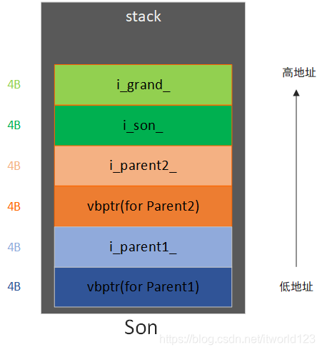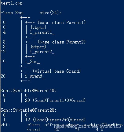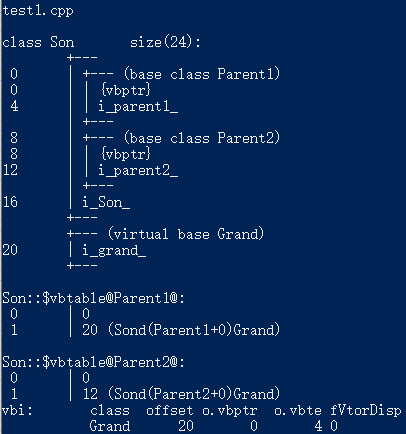 - 若 Grand 类为虚基类,则 Parent 类和 Son 类的内存布局中,该虚基类会排布在该类的最下面。