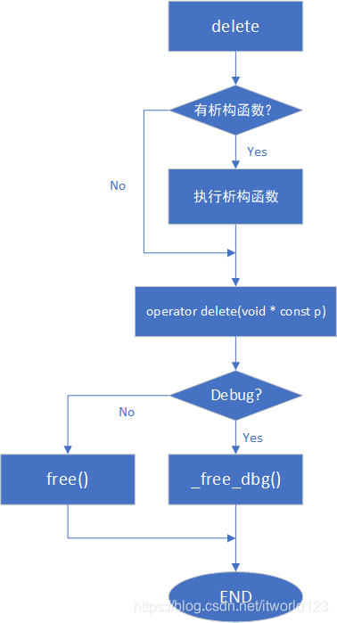 由代码可知,delete 操作本质上是调用了 free 函数,只不过针对是否是 Debug 模式而调用了不同版本的 free 函数。