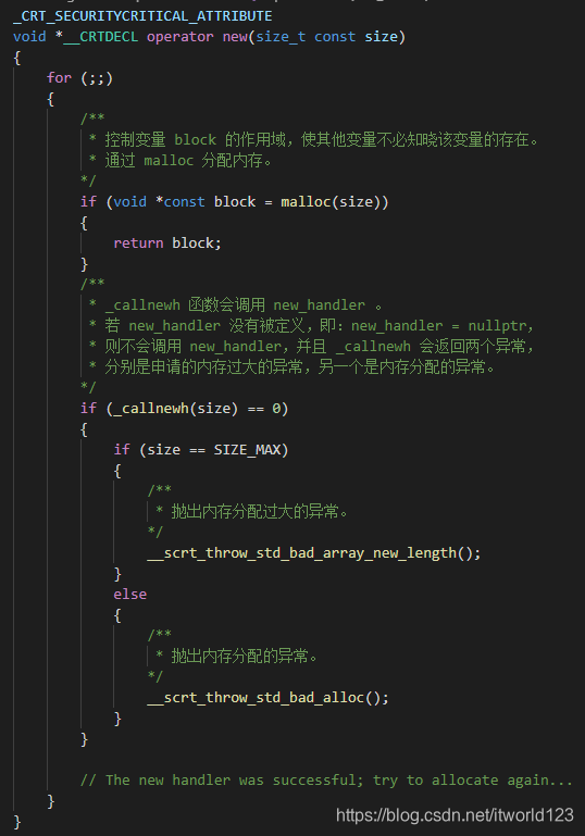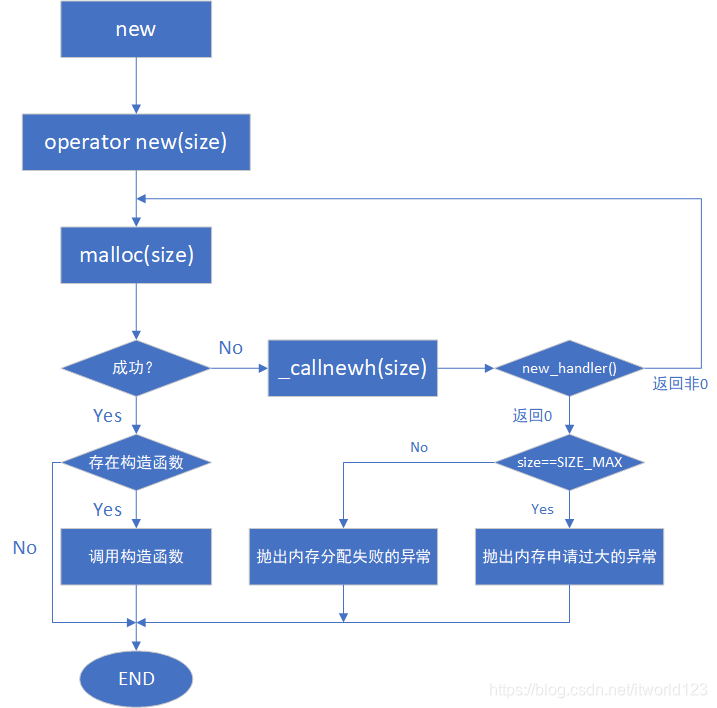 (2)operator new 是函数,C++提供一个默认版本,里面包含了 malloc 和 异常处理。做为程序员,所能控制的两个函数是 operator new 函数和 new_handler 回调函数,前者可以对其进行重载,实现自己的内存分配函数,后者可以对其编写,实现当内存申请失败时所需要执行的操作,这样就避免了程序抛出异常。