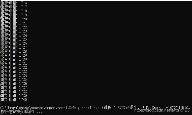 {static size_t sum = 0;sum++;std::cout << "重新申请 " << sum << std::endl;return 1;