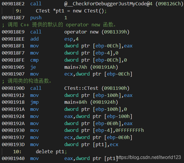 在 new 的位置打下断点,查看反汇编代码(调试 -> 窗口 -> 反汇编),得到如下代码,