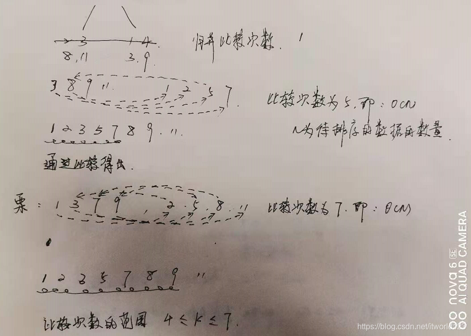 这里的 T(a) 表示单次递归时的耗时,T(a1)代表均分之后前一部分的排序时间,T(a2)代表均分之后后一部分的排序时间,t 为二者合并时间。通过代码发现,合并 n 个数据,需要比较 n 次,如下图所示: