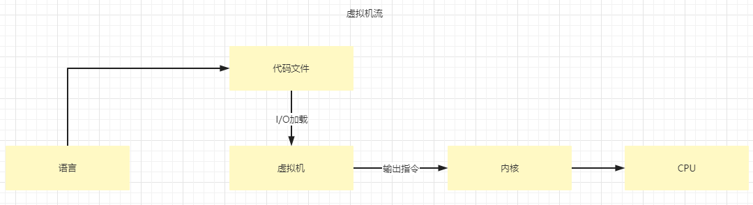 虚拟机流一般采取的形式是代码呈现于物理文件存储,系统运行起来是一个C应用(基本所有OS都支持C),然后这个应用启动后完成代码的读取,转换,推送,与执行