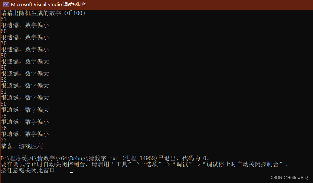 {int num2;srand((unsigned int)time(NULL));int num1 = rand() % 100 + 1;cout << "请猜出随机生成的数字(0~100)" << endl;start = clock();while (1){cin >> num2;if (num2 > num1){cout << "很遗憾,数字偏大" << endl;}else if (num2 < num1){cout << "很遗憾,数字偏小" << endl;}else if (num2 = num1){cout << "恭喜,游戏胜利" << endl;break;}}return 0;