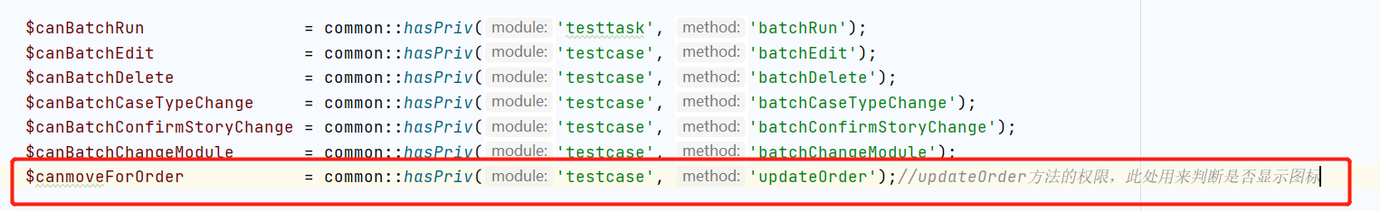 $canmoveForOrder = common::hasPriv('testcase', 'updateOrder');//updateOrder方法的权限,此处用来判断是否显示图标
