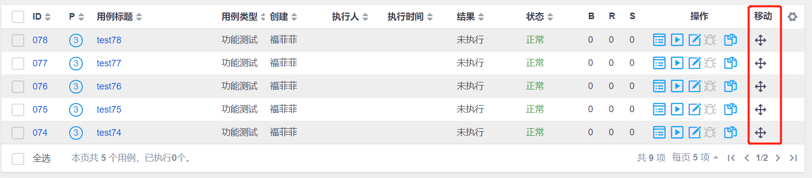 修改 $config->testcase->datatable->defaultField 值,在最后增加‘move’参数: