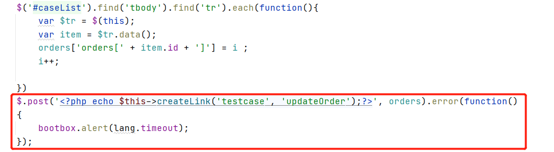 $.post('createLink('testcase', 'updateOrder');?>', orders).error(function(){bootbox.alert(lang.timeout);});