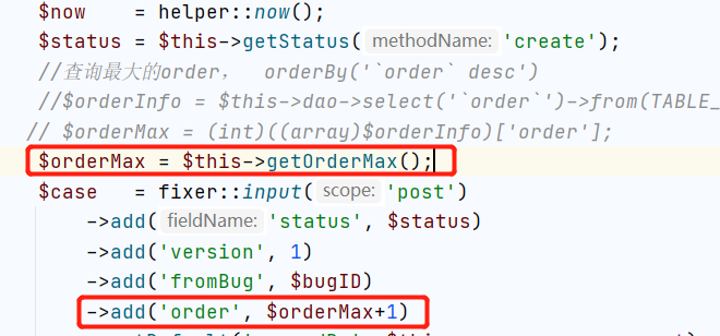 /*** 获取最大的order** @param* @access private* @return int*/private function getOrderMax(){$orderInfo = $this->dao->select('`order`')->from(TABLE_CASE)->where('deleted')->eq(0)->groupBy('`order`')->orderBy('order_desc')->fetch();//deleted 数据库字段,0:未删除,1已删除$orderMax = (int)((array)$orderInfo)['order'];return $orderMax;}