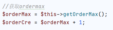 //获取ordermax$orderMax = $this->getOrderMax();$orderCre = $orderMax + 1;