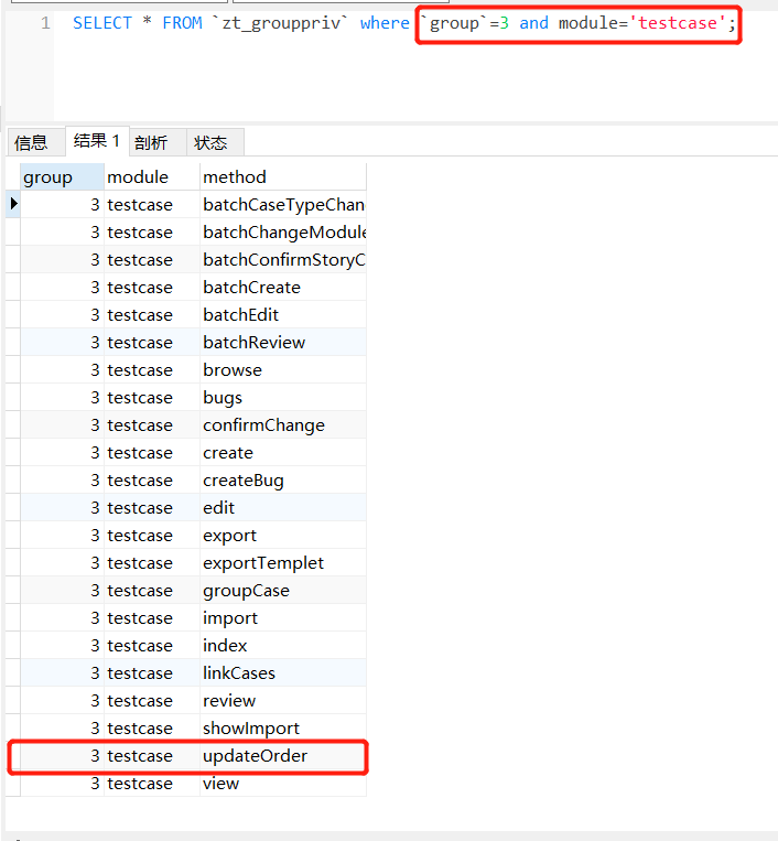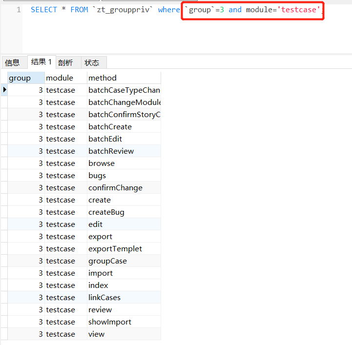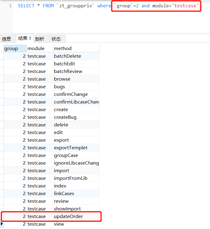 而group为3 和 group为2的权限各有不同,看【zt_grouppriv】表:(其中 module='testcase'就是我们的【功能测试】模块)