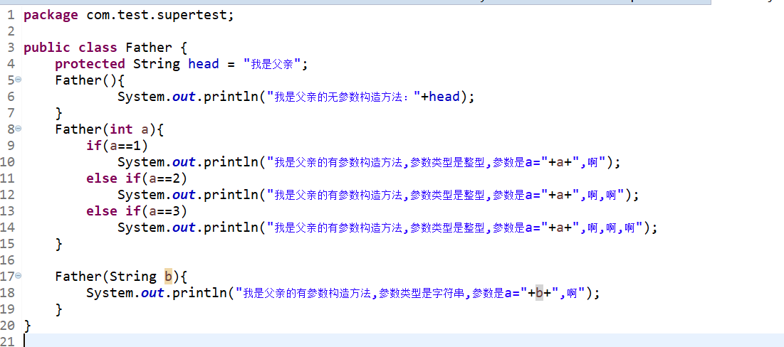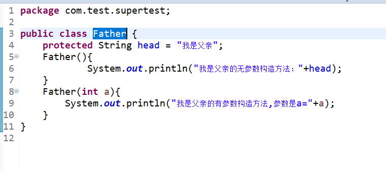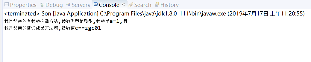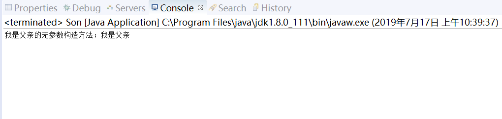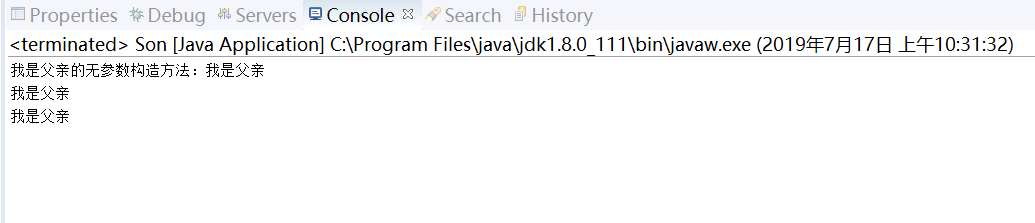 又以上结果可知,理论与实践相符!!!(其中“我是父亲的无参数构造方法…..”这句话之所以输出,是因为在Son(String str)此构造方法里面自动加上了super()而在Father( )里面有向控制台输出的语句。)