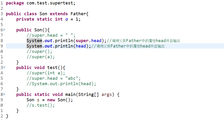 为什么在Son这个类中并没有一条输出语句,但是还是输出了一句话?就是因为用new关键字去创建对象的时候,会去调用此类的构造方法,而在此构造方法中的第一句,就默认为是:super( ),也就是去调用了父类的无参构造方法 这一句代码是自动加上去的,哪怕自己不在第一行写上:super( ),就像写一个类,如果不写这个类的构造方法的话,会自动加上一个public void修饰的,并且方法体为空的方法一样,当然自己加上也是可以的,但是加的时候必须要在子类构造方法的第一句。