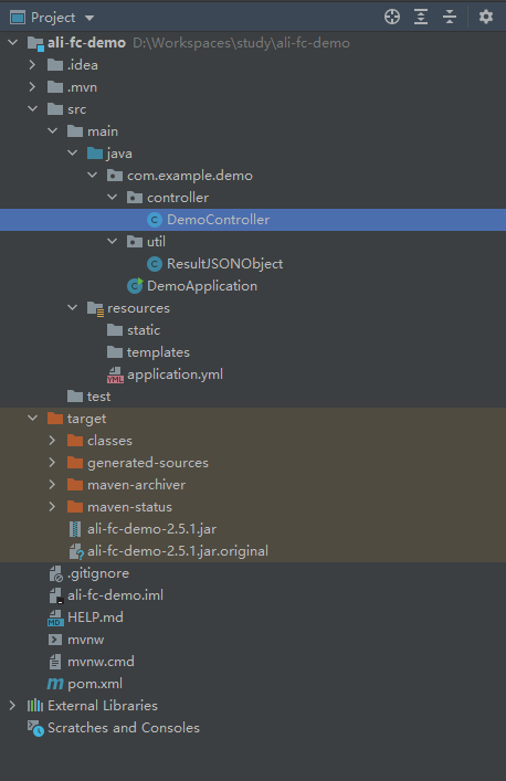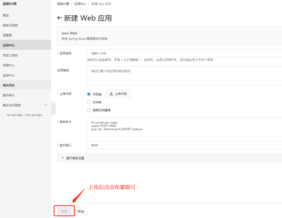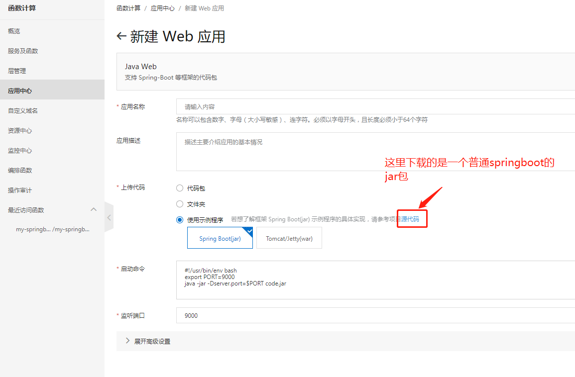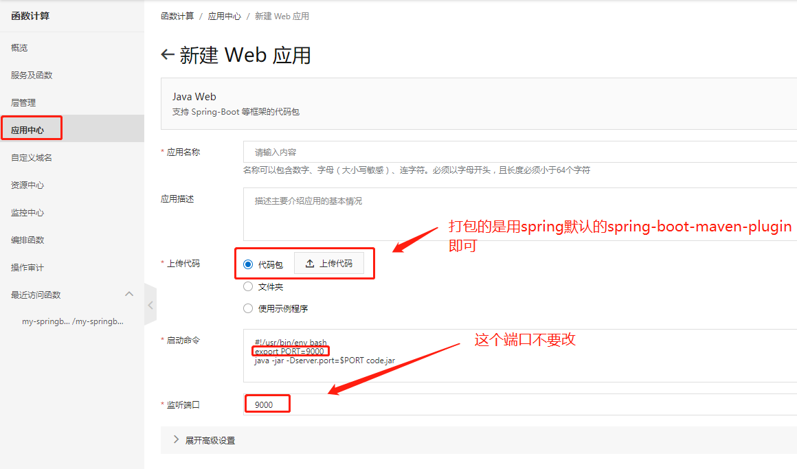 无奈之下改用阿里云的函数计算(对应腾讯云的云函数),阿里云这个相对简单,打成的jar包可以用springboot默认的spring-boot-maven-plugin,也不需要创建Handler类作为启动类,也就是直接把自己开发的springboot扔上去就可以了。