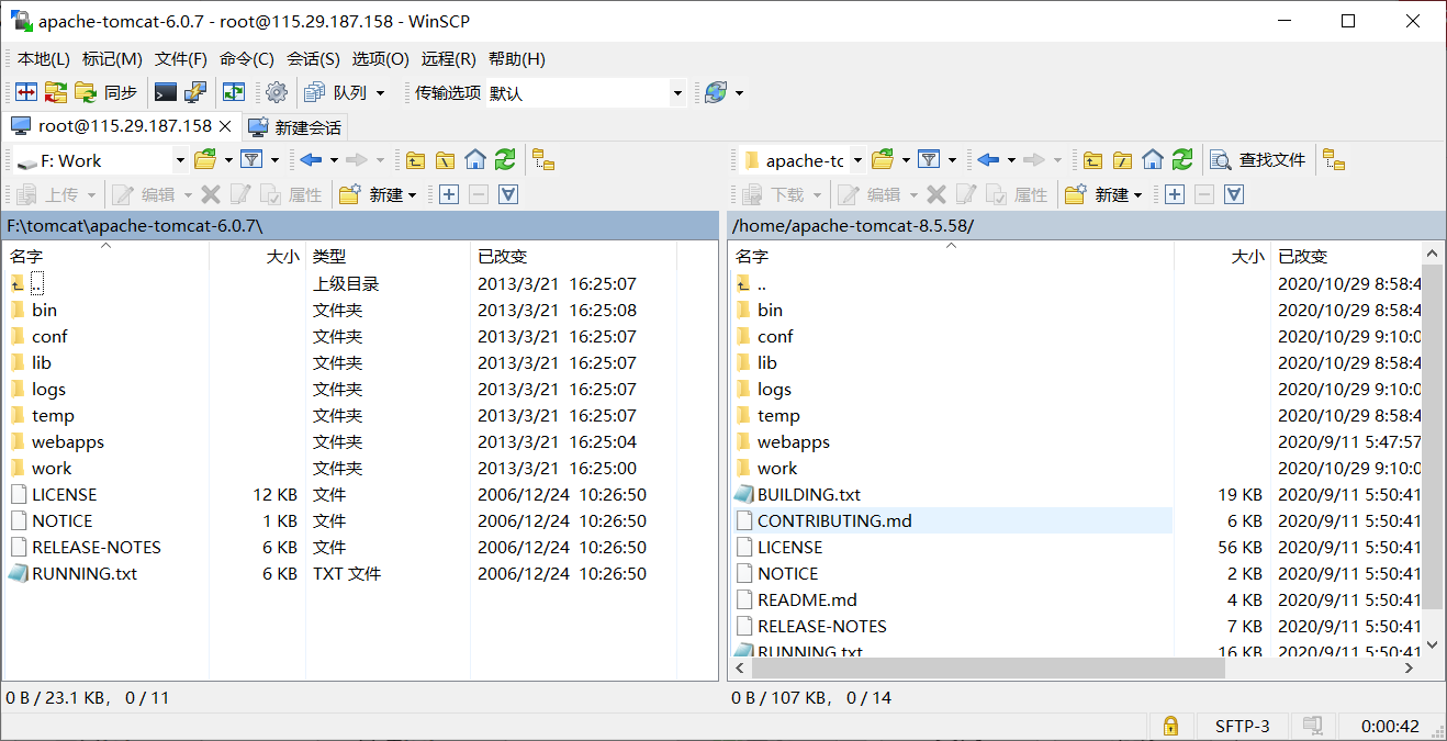 2.登录成功后如下,左边是我本地tomcat文件夹,右边是服务器上的tomcat,将本地webapps中的项目拖拽到右边就完成了部署