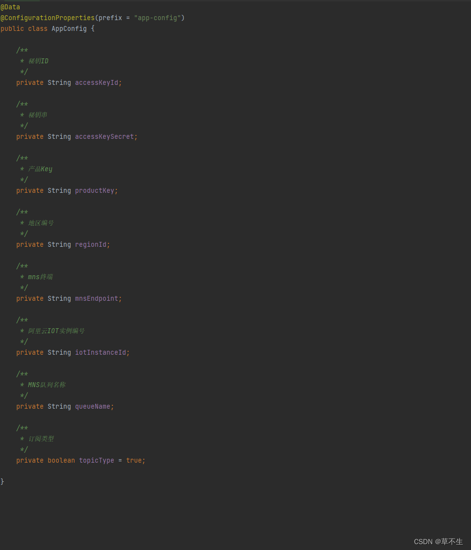 public class DeviceConfig implements Serializable {/*** 验签信息*/private String sn;/*** 产品唯一key*/private String productKey;/*** 设备编号*/private String deviceName;/*** 设备秘钥*/private String deviceSecret;/*** 地址*/public String host;/*** 端口*/public int port;/*** 阿里云实例ID*/private String iotId;/*** token验签信息*/private String iotToken;/*** 创建时间*/private Date createdTime;/*** 过期时间 默认7天过期*/private Date overdueTime;/*** 时间戳*/private String timeStamp;}