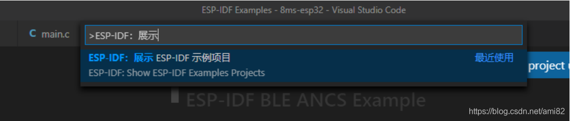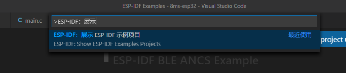 以下为ESP-IDF编译工程步骤: 一. 点击上述’View ESP-IDF project examples’ 或者 Shift+ctrl+P - 在上述弹出框输入 ESP-IDF:展示